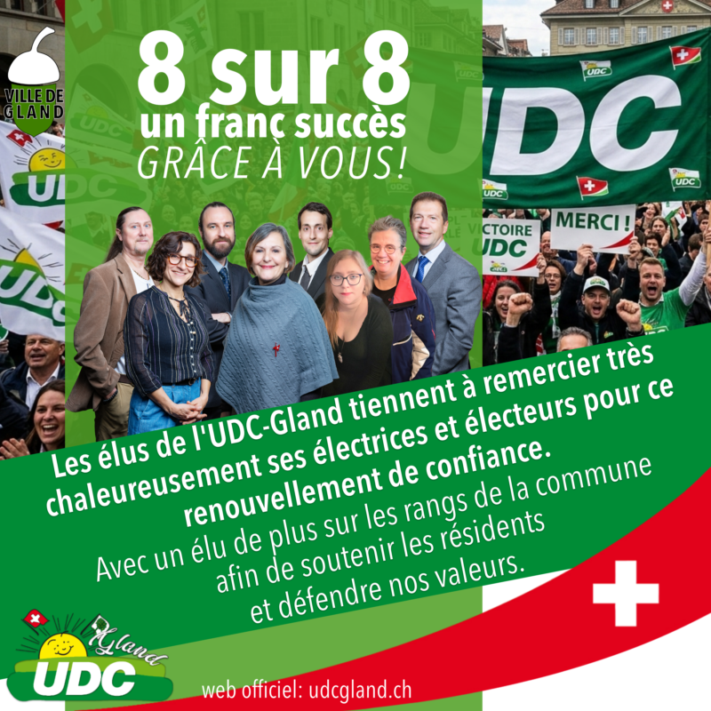 Le comité de l’UDC Gland exprime sa profonde gratitude aux électeurs et électrices qui ont plébiscité notre programme et nos valeurs. Ce renforcement au Conseil communal nous permettra de peser davantage dans les débats locaux pour garantir la qualité de vie et la saine gestion de Gland.